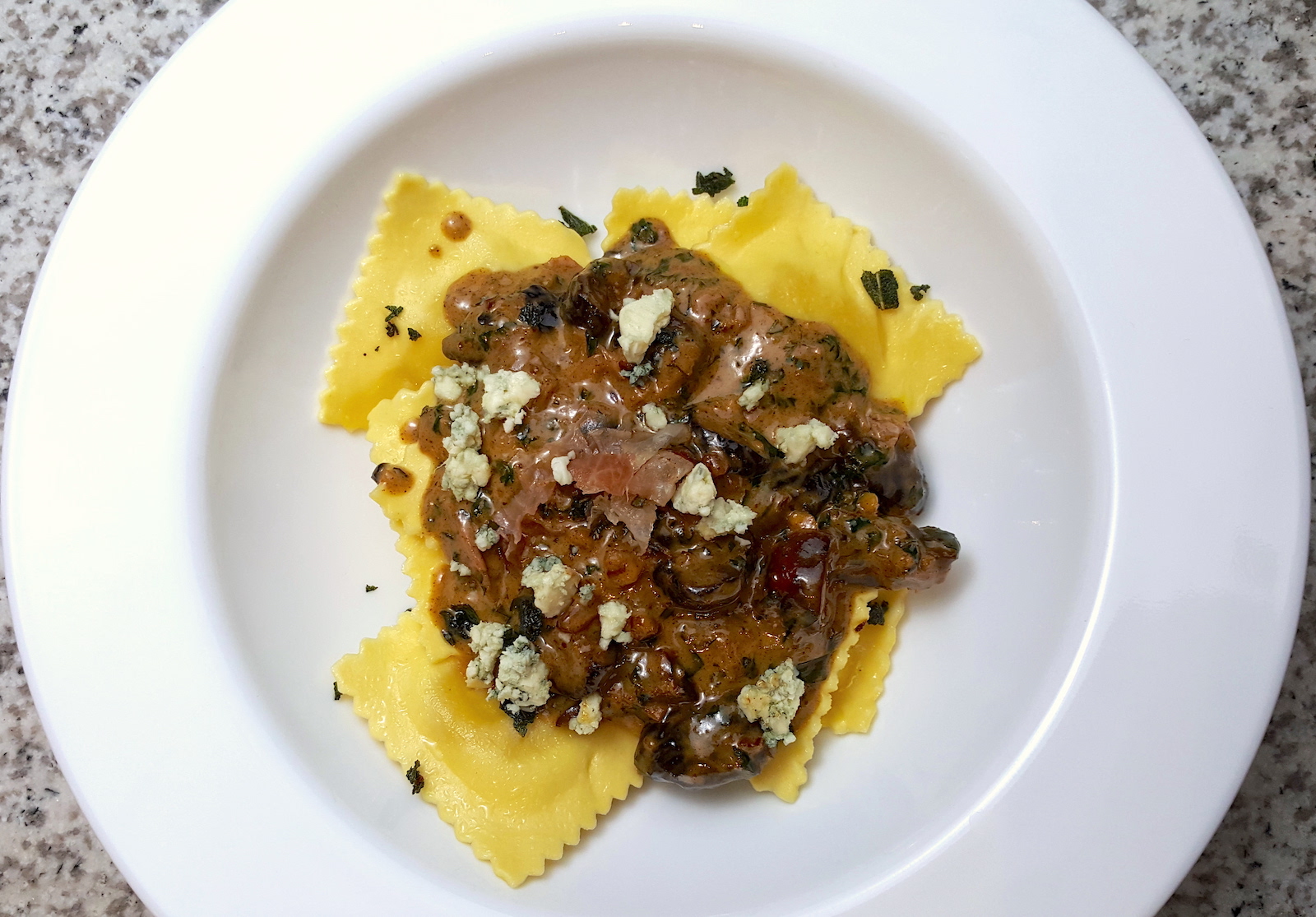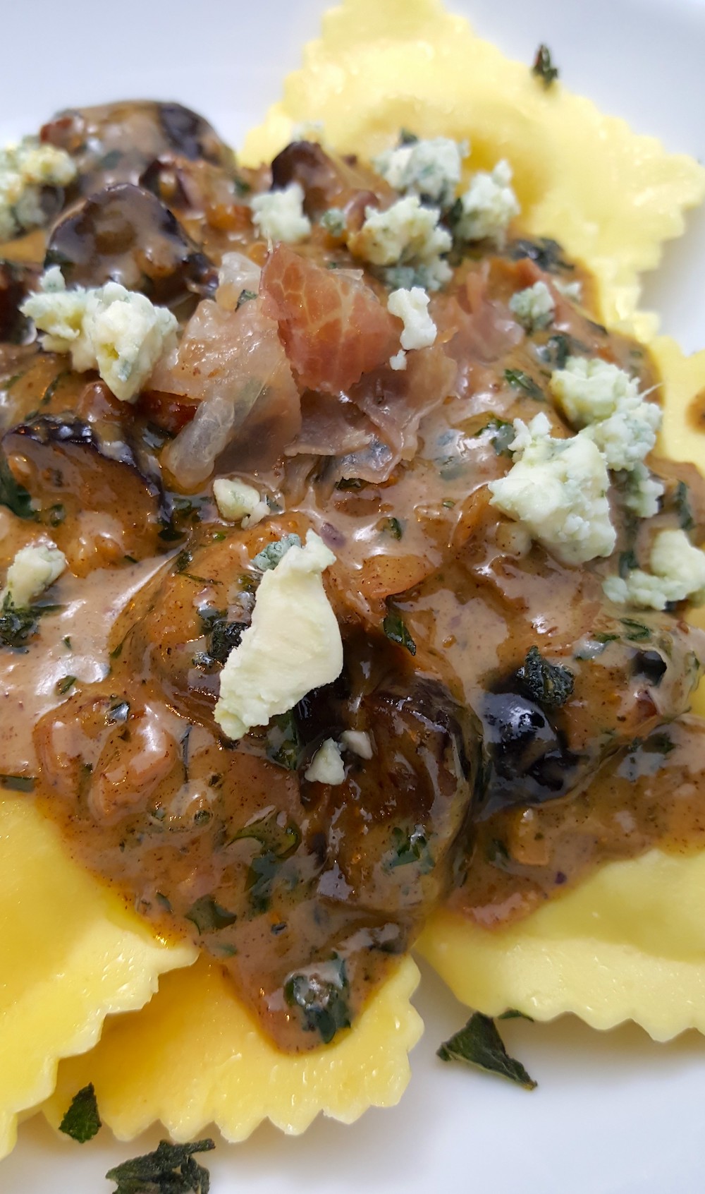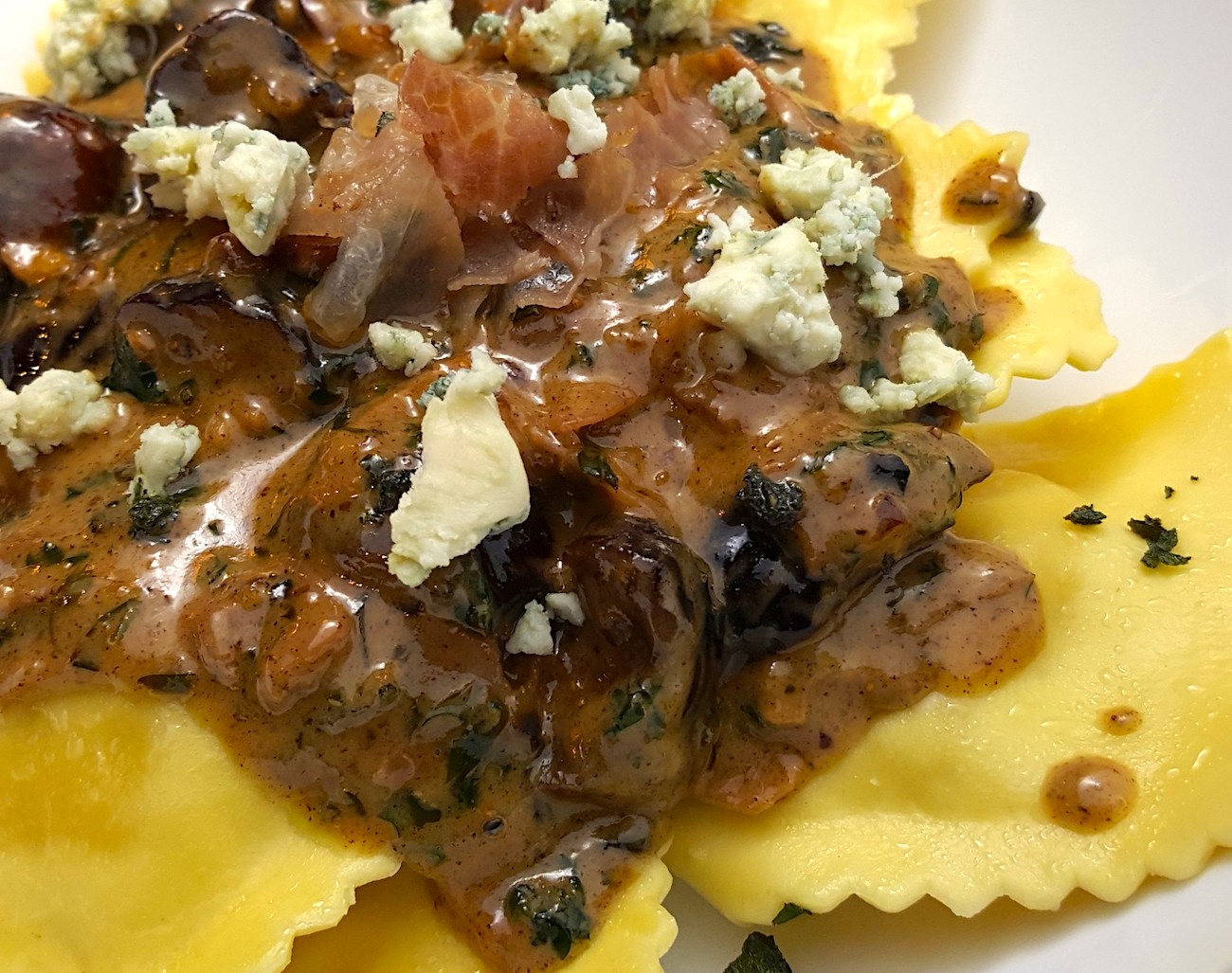 Brown Butter Pecan Sauce over Ravioli w/ Toasted Figs & Crispy Prosciutto, topped w/ Crumbled Gorgonzola:
