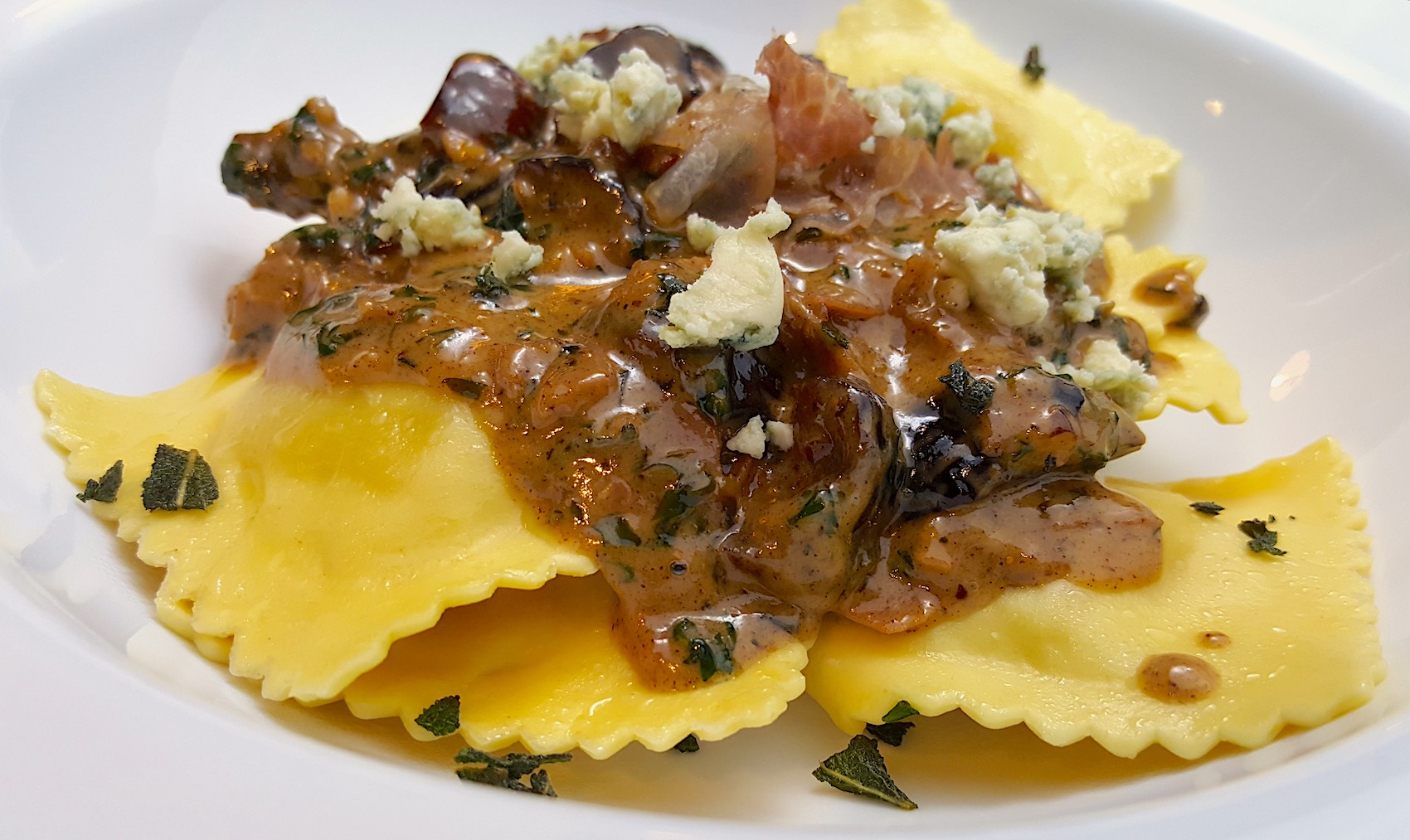 7. Plate ravioli in a pasta bowl, cover with brown butter pecan and fig sauce, garnish with crispy sage and prosciutto, sprinkle with crumbled gorgonzola cheese and enjoy!