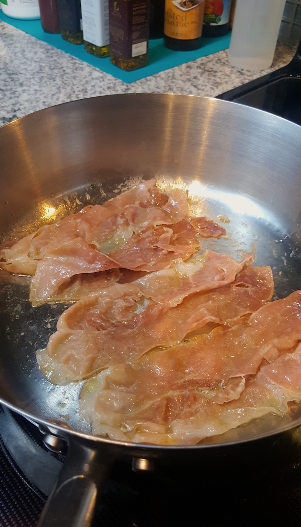2) Crisp the sliced Prosciutto on medium heat, in a medium deep saute pan w/ a tiny drizzle of EVOO. After a few minutes, flip each piece using tongs to crisp up both sides. When cooked to your liking, remove them to a paper towel lined plate.