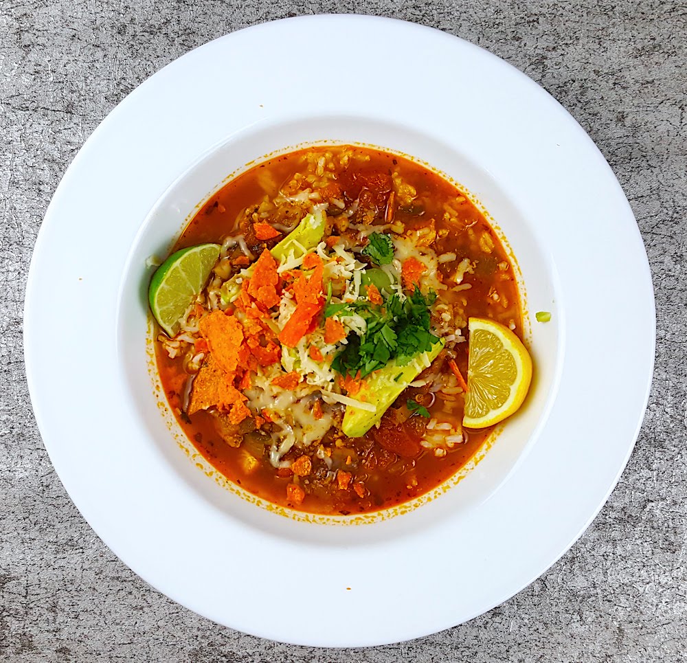 Chicken Tortilla Soup w/ Avocado, Cilantro, and Pepper Jack Cheese