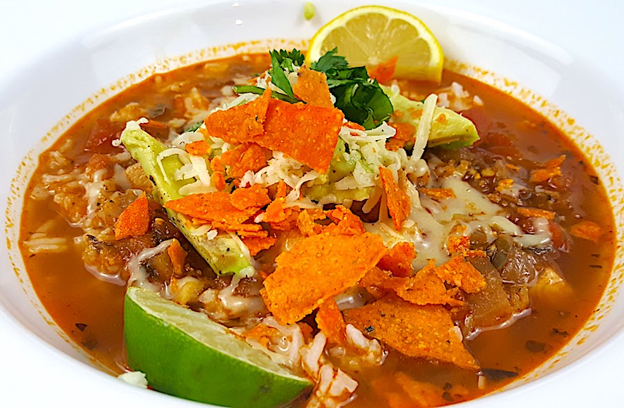 10. Using a spoon, scoop desired amount of rice into each bowl. Take the soup ladle and top the rice with Chicken Tortilla Soup. Add on all of your must have toppings, then serve and enjoy!