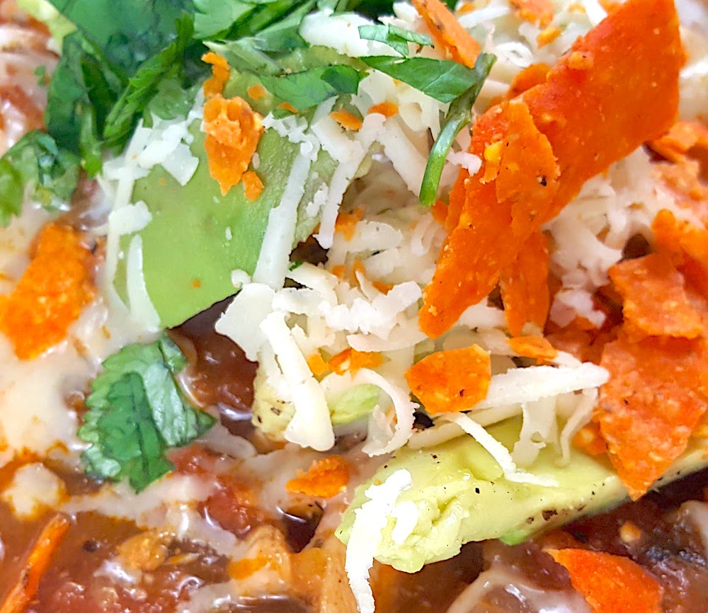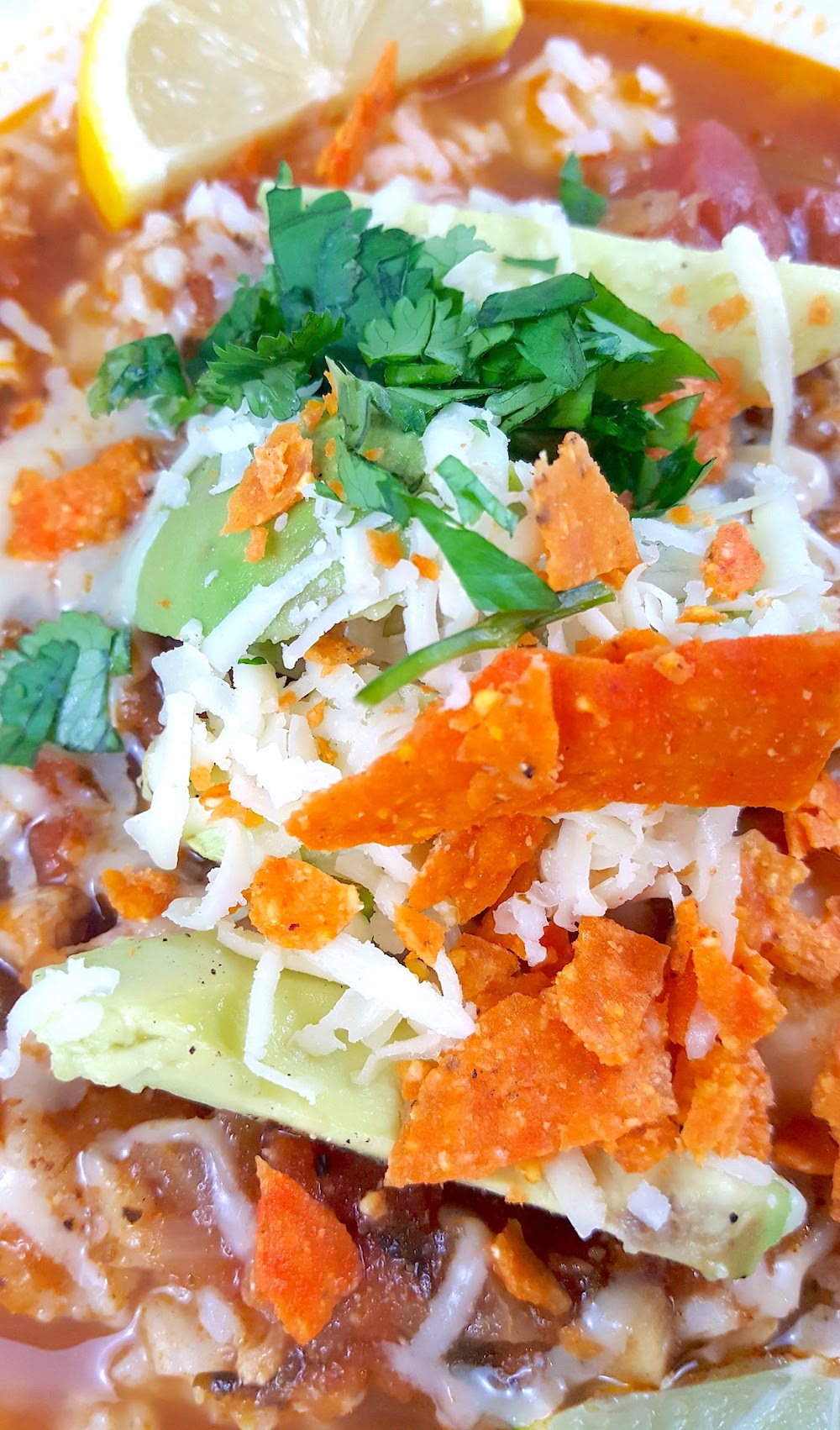 8. While everything is simmering, prep all the toppings. Slice the lemon, lime, and the avocado. (I like to drizzle my avocado with lemon and lime juice, EVOO, and a dash of salt and pepper.) Chop the cilantro, shred the cheese, and crumble the Old El Paso Bold Nacho Cheese Flavored Taco Shells.
