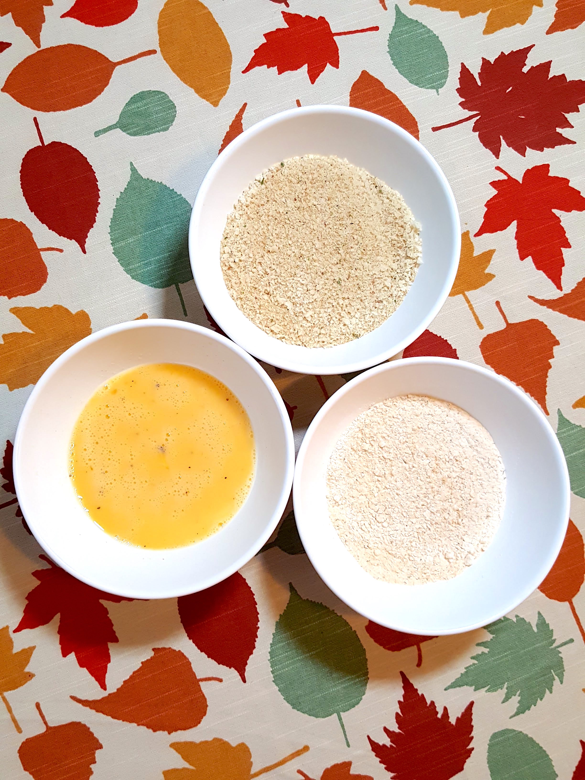 1st) Flour Mix 2nd) Egg Wash 3rd) Breadcrumbs