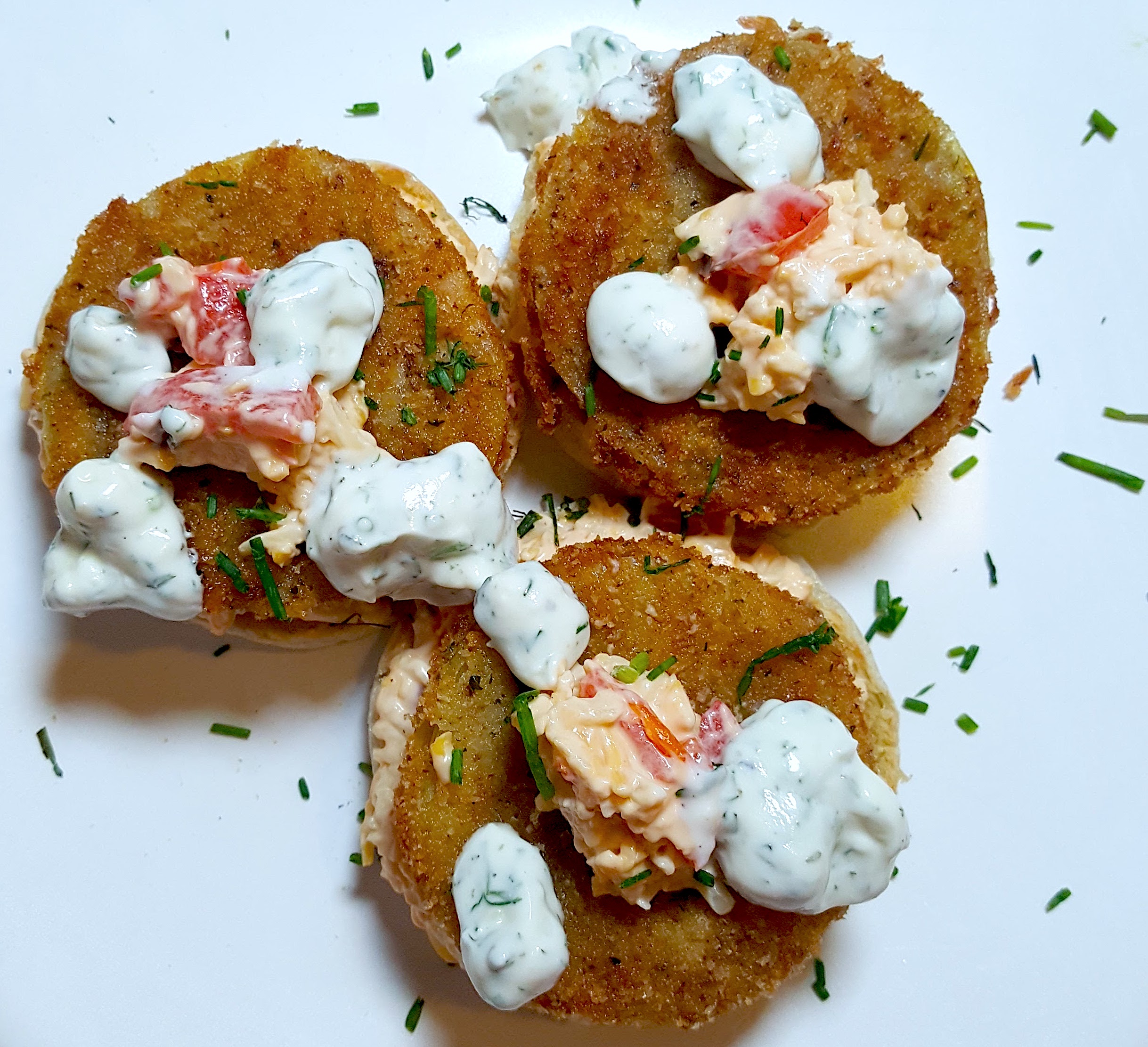 Gillian’s Southern Fried Green Tomatoes with Pimento Cheese and Gorgonzola Homemade Ranch Sauce