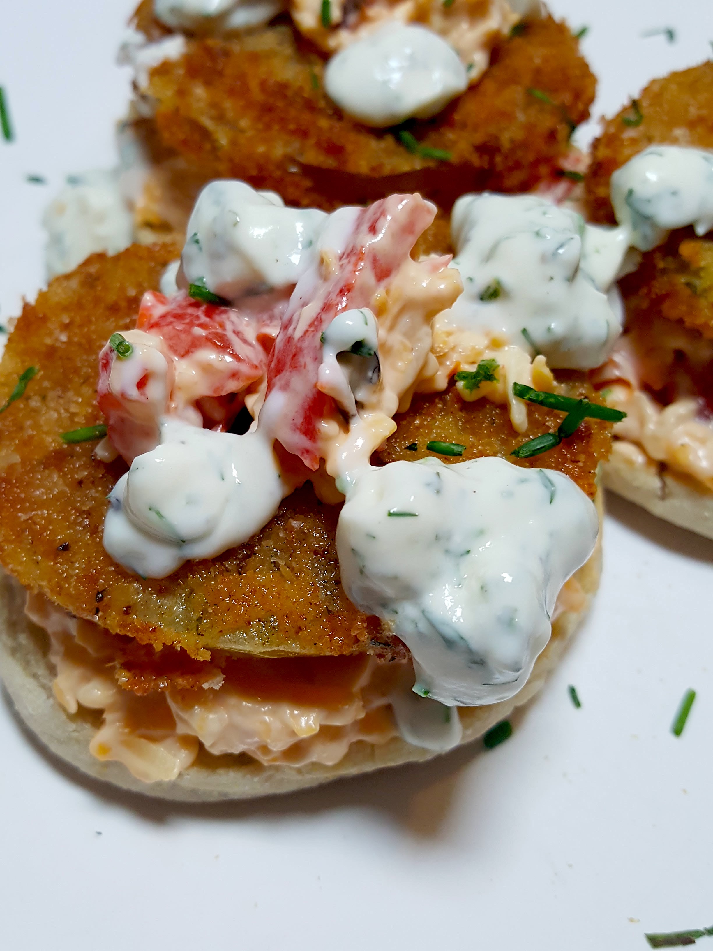 English Muffin smeared with Pimento Cheese, Topped with FGT’s, another small dollop of Pimento Cheese, followed by a drizzle of Homemade Gorgonzola Ranch Sauce 🙂 Enjoy!!