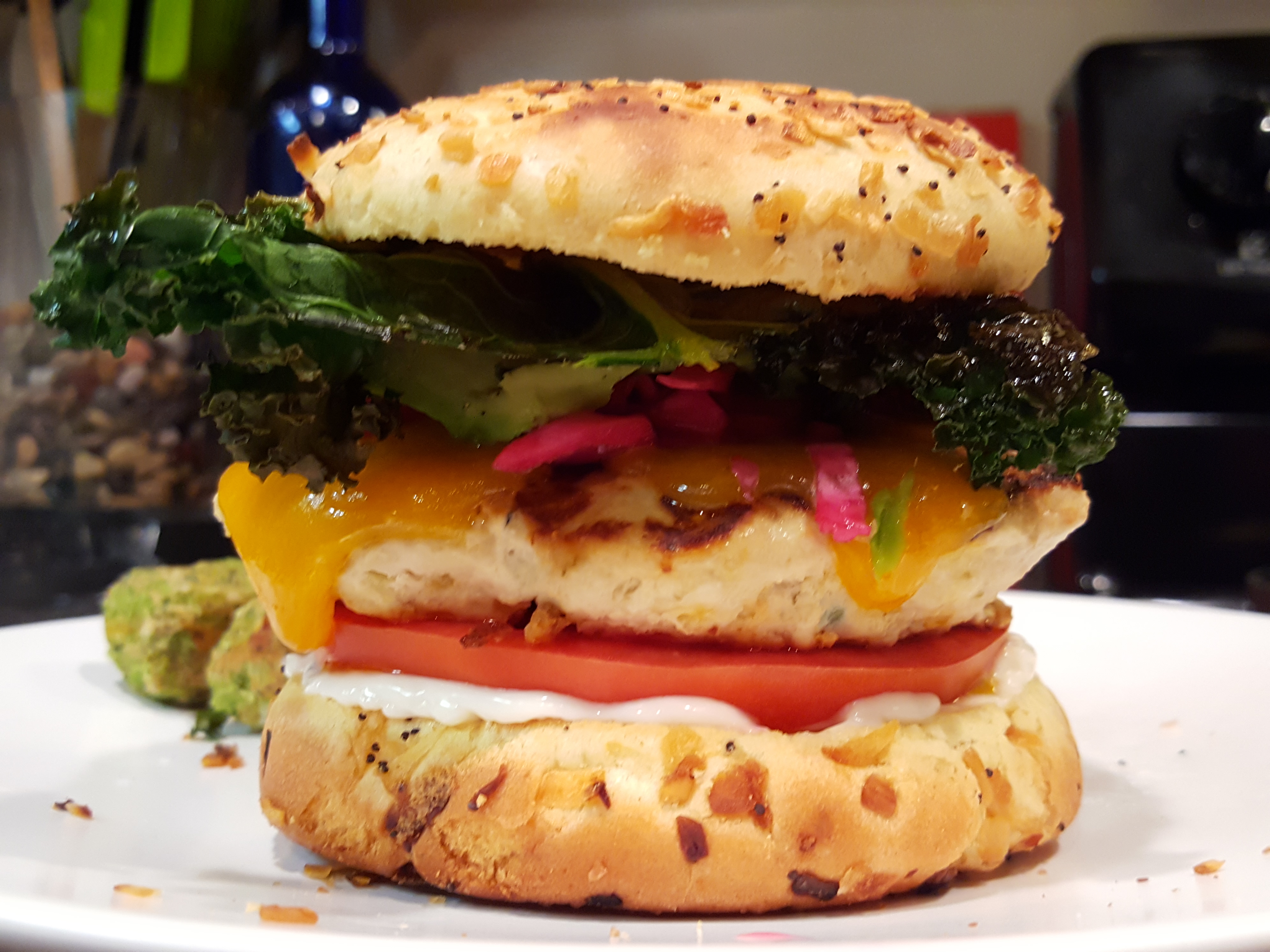 How I build Mine: Bottom bun, layer of mayo, slice of tomato, turkey burger, spoonful pickled purple cabbage, crispy kale, mustard, top bun!