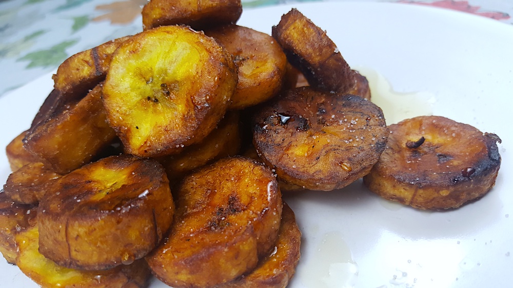 9. If you want to make plantains: I bought two, sliced them into rounds, and fried them in sunflower oil. Remove them, carefully from the hot oil, with tongs or a slotted spoon to a paper towel lined plate, then sprinkle with sugar, and drizzle with a desired amount of honey! THESE ARE AMAZING!!!!!!