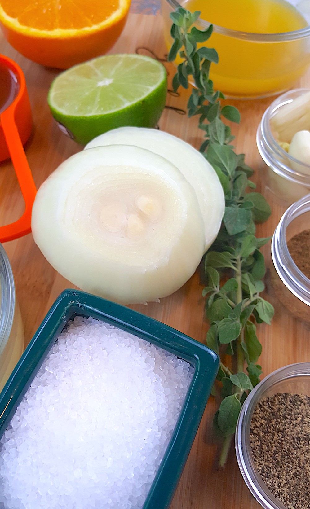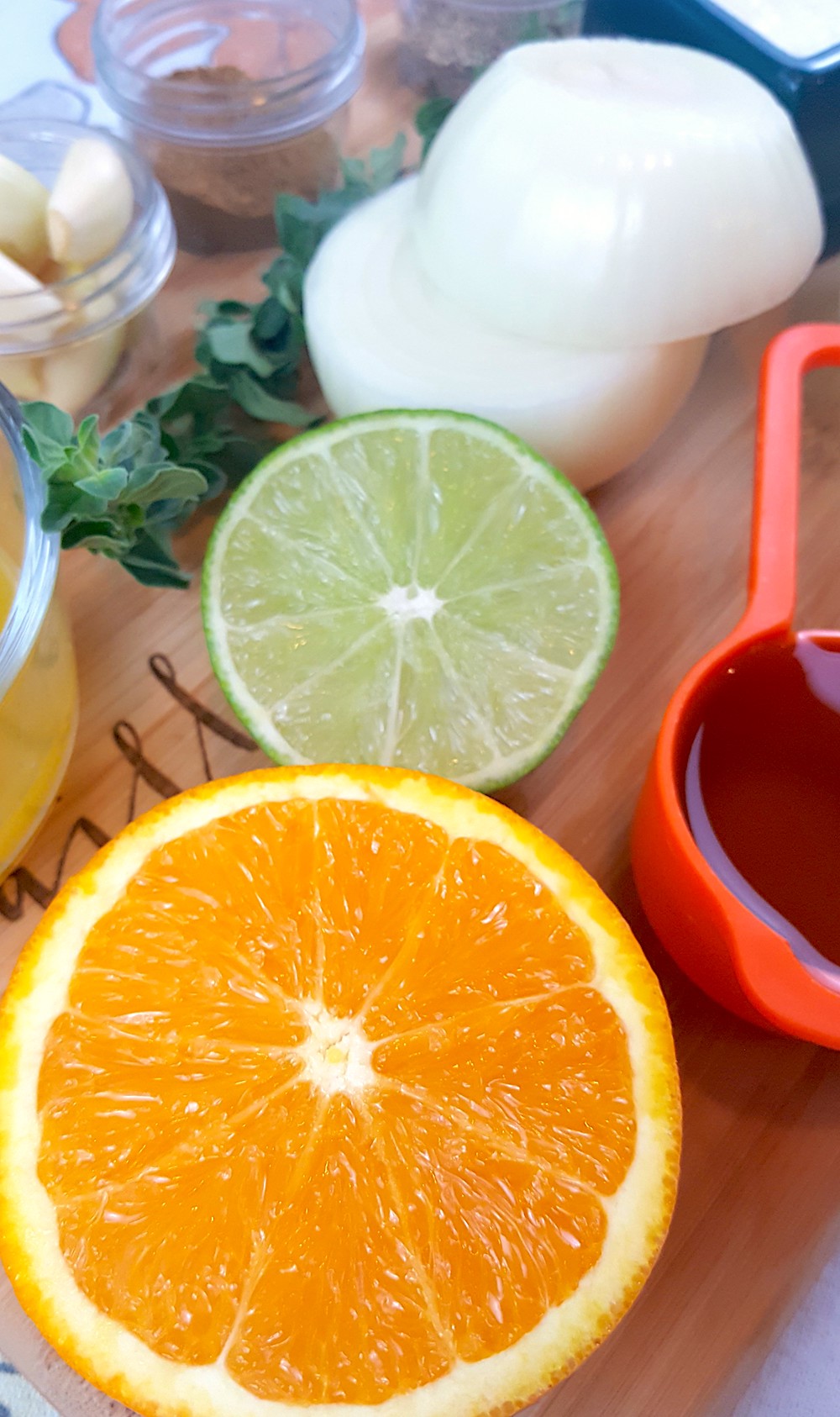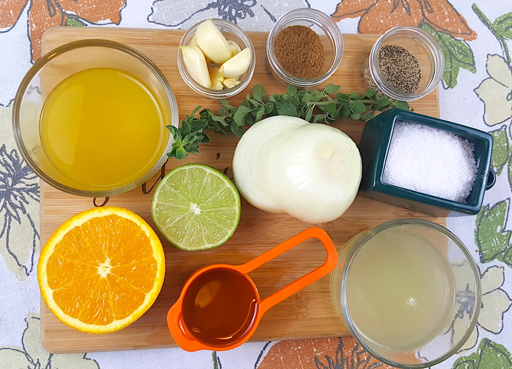 2. Gather all your ingredients; chop the garlic and onion, juice the oranges, and limes, measure the oil and spices, and tear off the leaves from the fresh oregano.