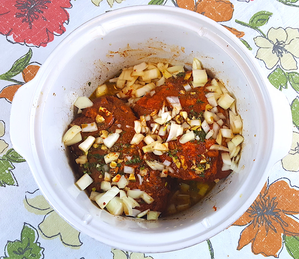 1. In the base of your crock pot is where the magic is going to happen. You can use a plastic bag or a bowl if you wish, but it’s so much easier to marinate the pork in your crockpot, put it in the fridge for an hour (or over night), then pop that bad boy in the base, plug it in, and go!