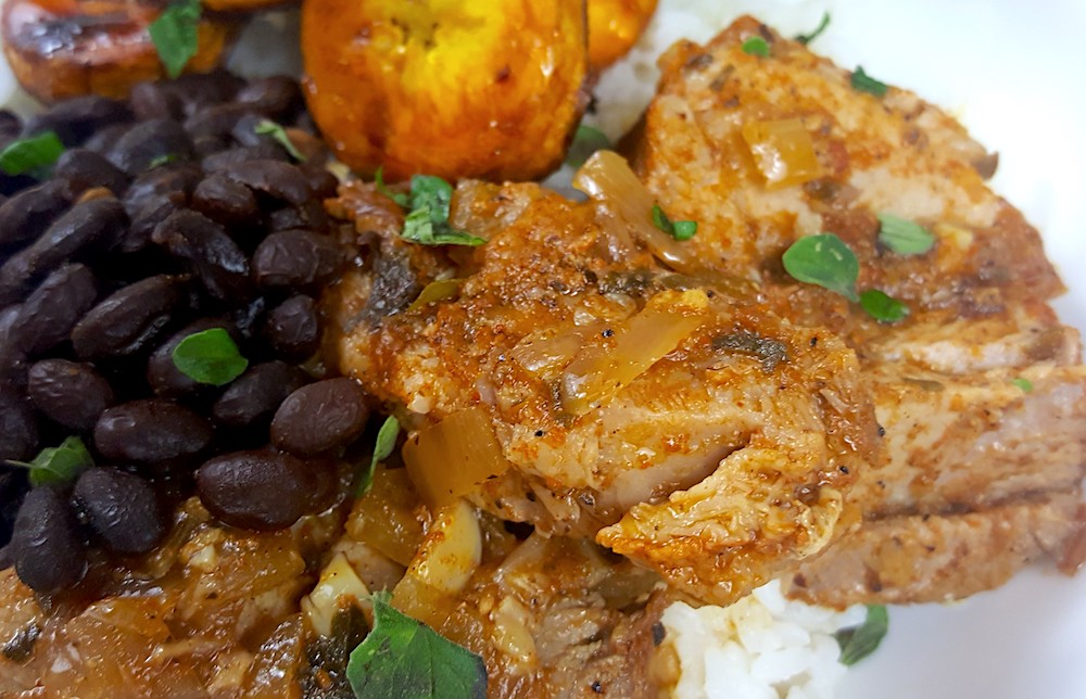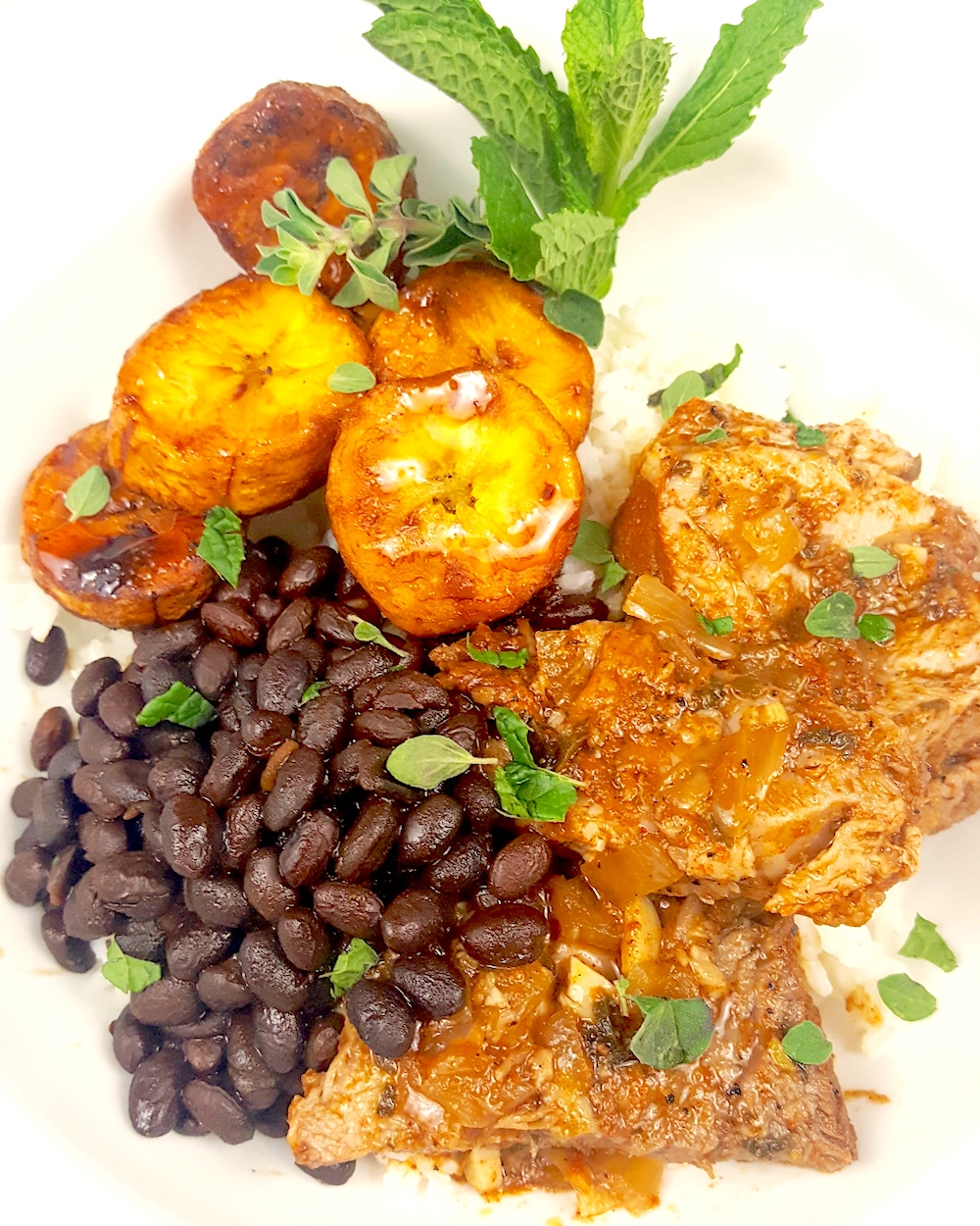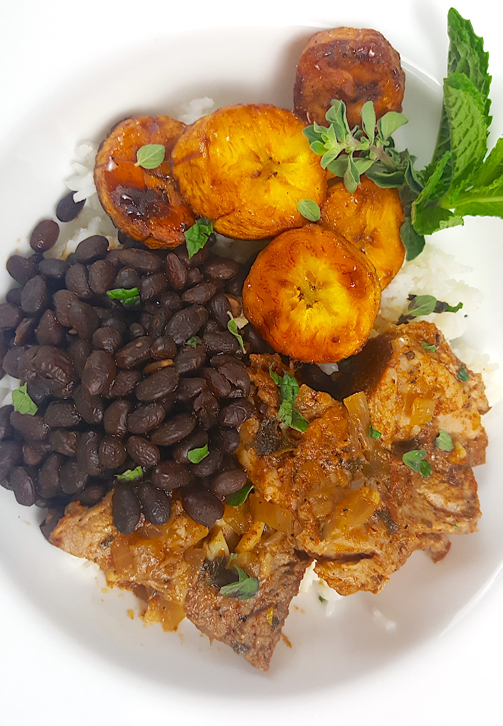 14. On a dinner plate serve the rice, black beans, plantains, and top off with some big beautiful chunks of Mojo Pork, and enjoy! Optional to rip up some fresh mint and oregano and sprinkle on top!