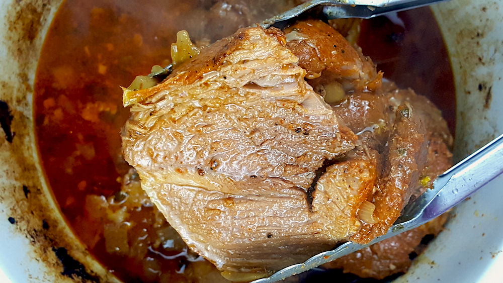12.Using two forks, pull some of the pork apart, and use the spoon again to cover in juices from the crockpot.