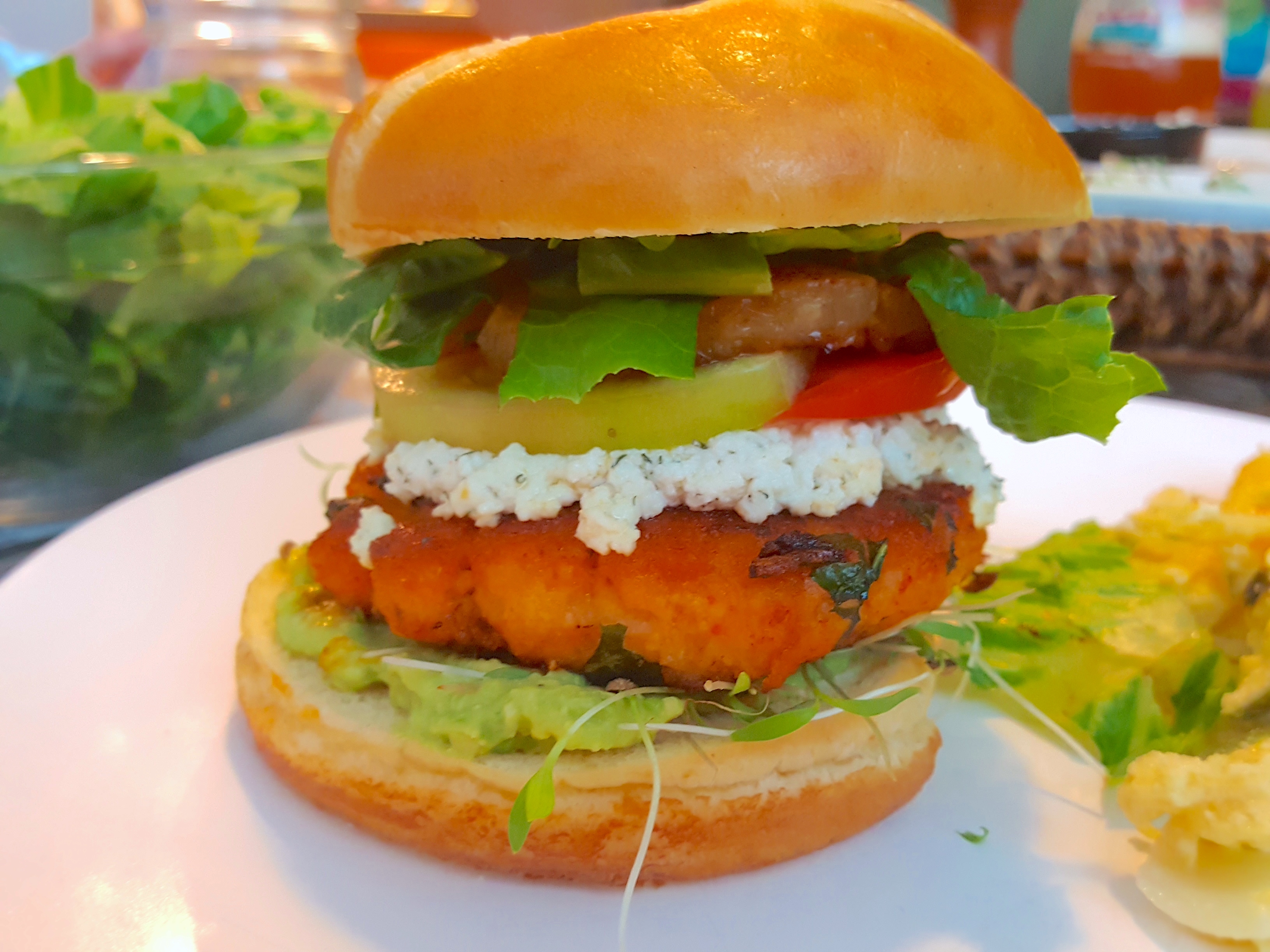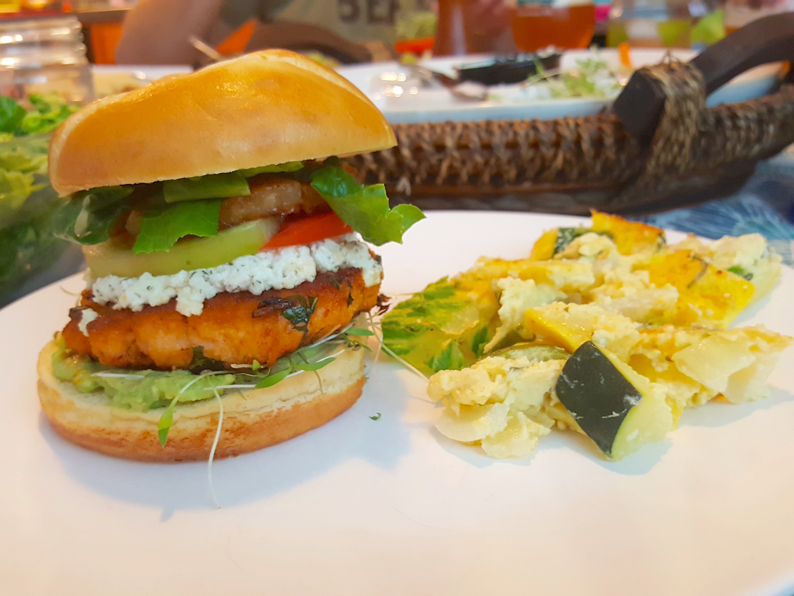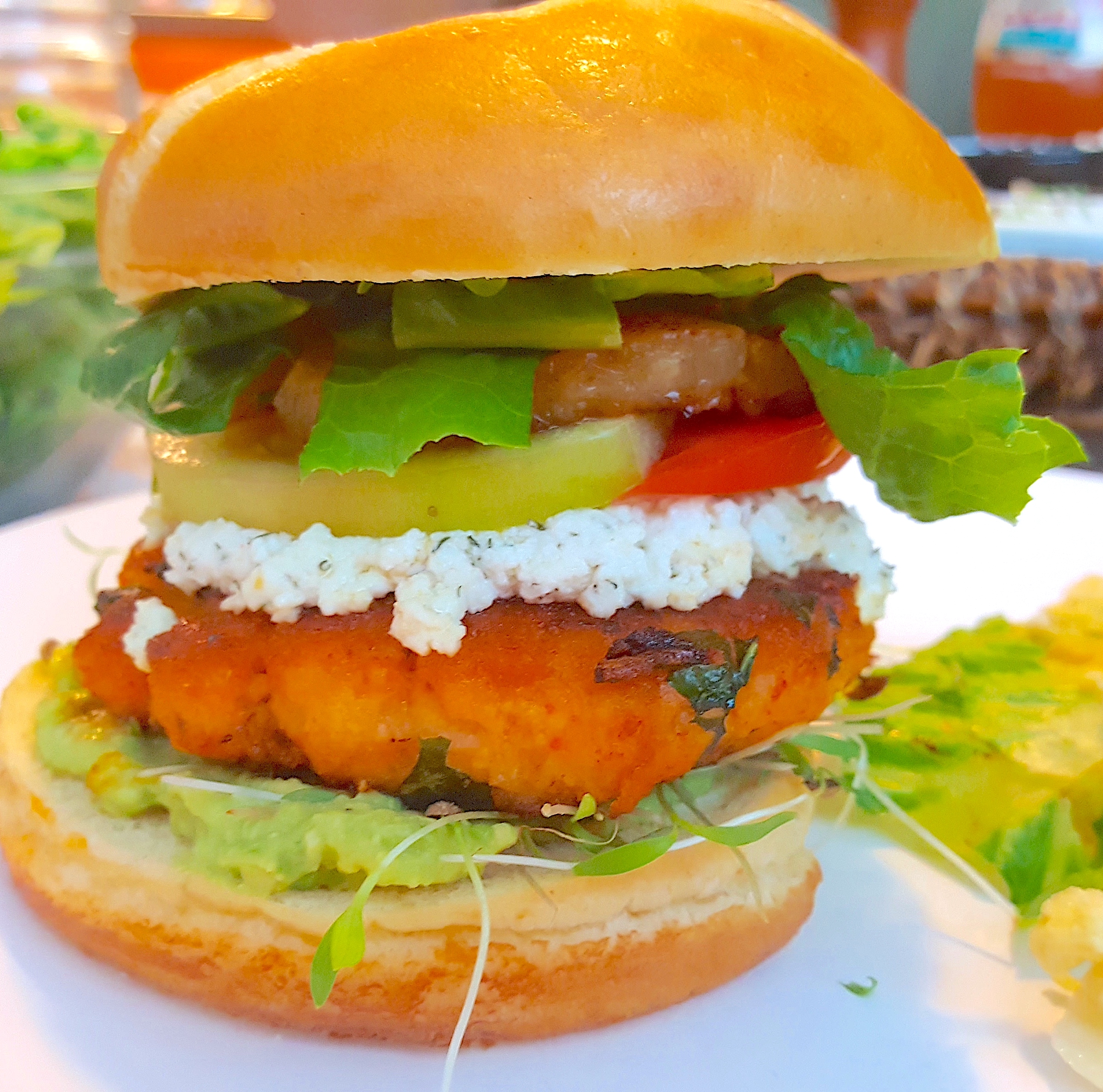 Sweet-N-Spicy Salmon Burgers w/ Dill and Garlic Goat Cheese, Guacamole, Heirloom Tomatoes, and Cayenne Sugar Grilled Pineapple