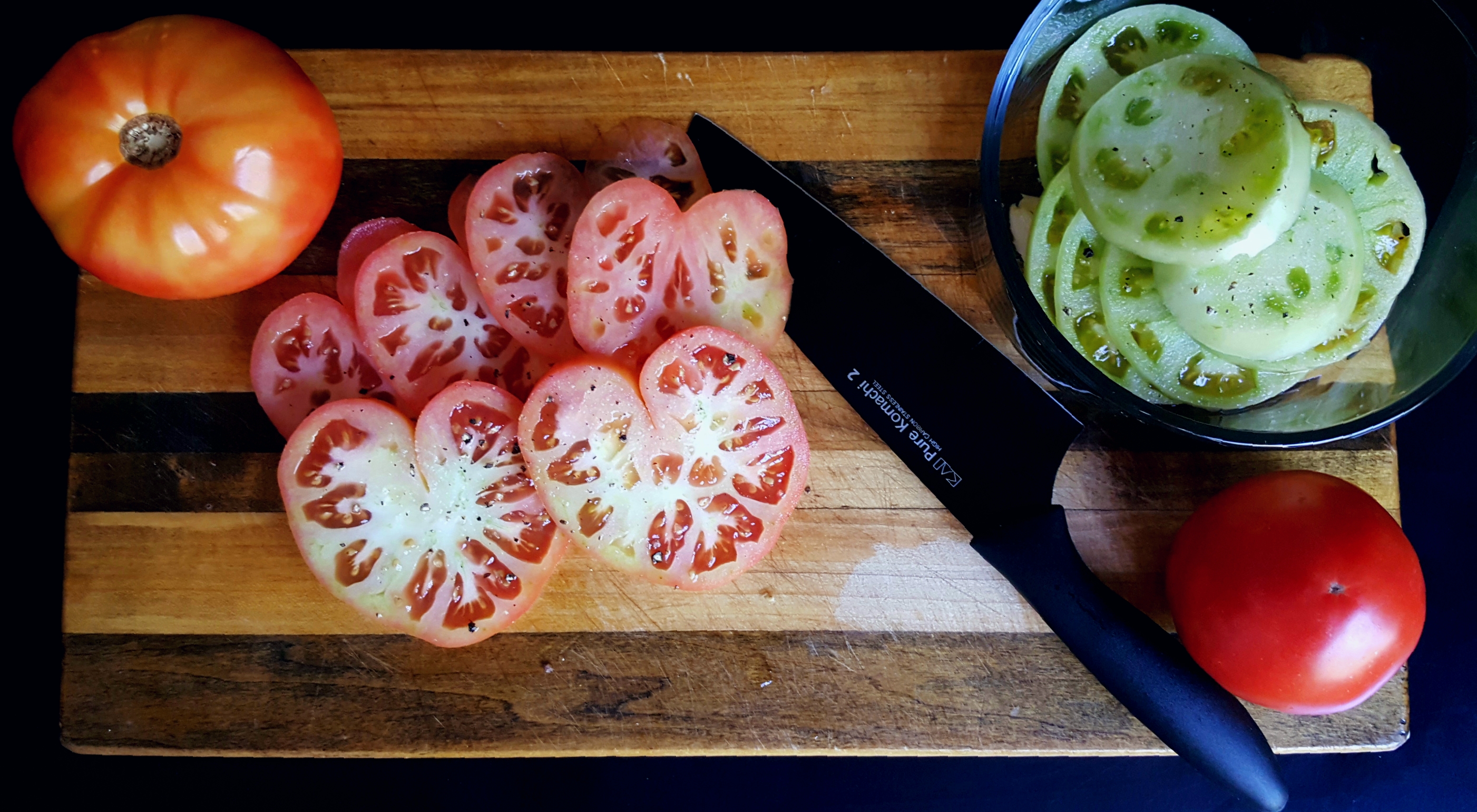 11. NOTE: Prep the toppings bar platter while the burgers are cooking: Slice the tomatoes, and to your platter add any ingredients you want! We went with pickled red onions, cilantro microgreens, live chopped bibb lettuce, sweet-n-spicy pineapple, and guacamole